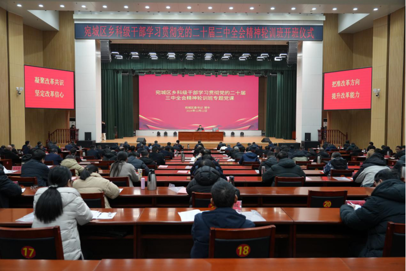 12月12日,南阳市宛城区举行乡科级干部学习贯彻党的二十届三中全会精神轮训班开班仪式,深入学习贯彻落实党的二十大和党的二十届三中全会精神,区委书记樊牛出席开班仪式并作动员讲话,区委副书记、统战部部长王龙主持。