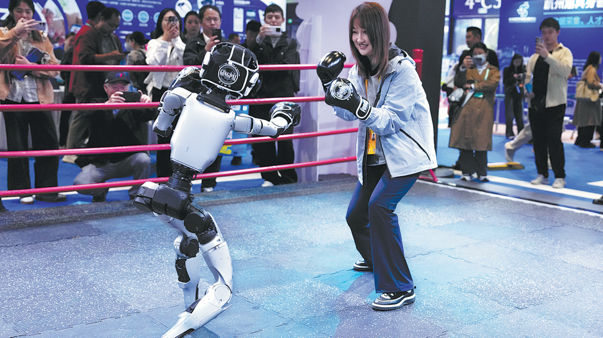 A participant boxes with a humanoid robot from Unitree Robotics during the 2025 World Internet Conference Wuzhen Summit in Wuzhen, Zhejiang province, on Nov 6. HUANG ZONGZHI/XINHUA