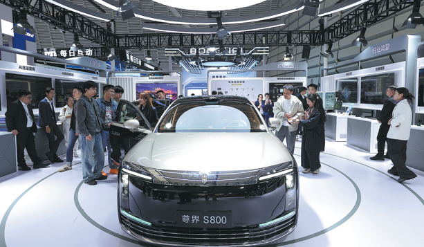 A MAEXTRO S800 sedan, jointly developed by JAC Motors and Huawei, is displayed during the 2025 World Internet Conference Wuzhen Summit on Nov 6. ZOU HONG/CHINA DAILY