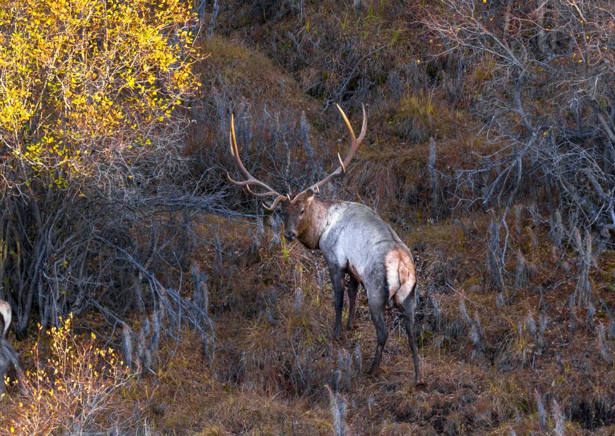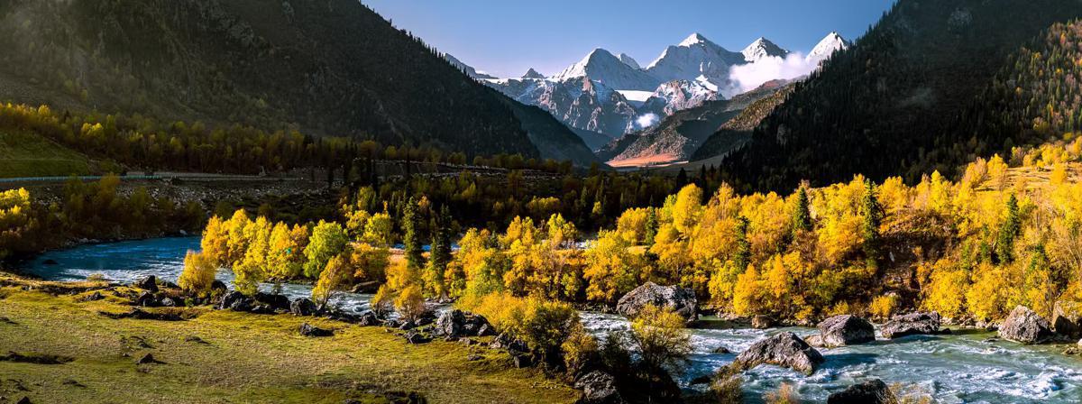 Spruce forests rise around the village like tiered pagodas, and a winding river flows through meadows and woodlands, where Tianshan red deer (Cervus elaphus songaricus) can occasionally be seen wandering or grazing.