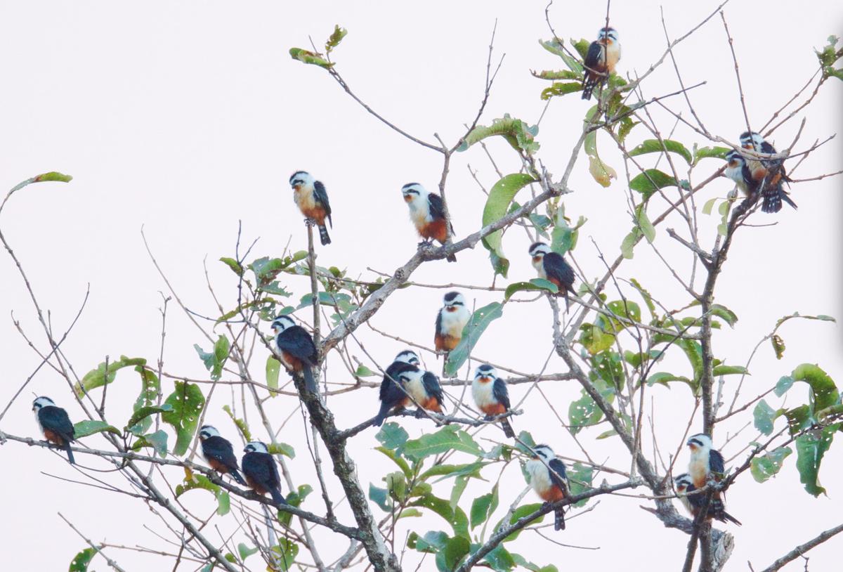 Seventeen collared falconets are captured in a single image on Dec 5 in Yingjiang county, Yunnan province.[Photo by He Haiyan/For chinadaily.com.cn]