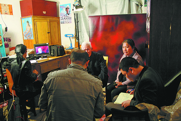 In November 2011, Guo Xiaoming (middle, back facing camera), an oral history interviewer documenting World War II veterans, interviews veteran Tan Zhaoxi (man with white hair). [Photo provided to China Daily]