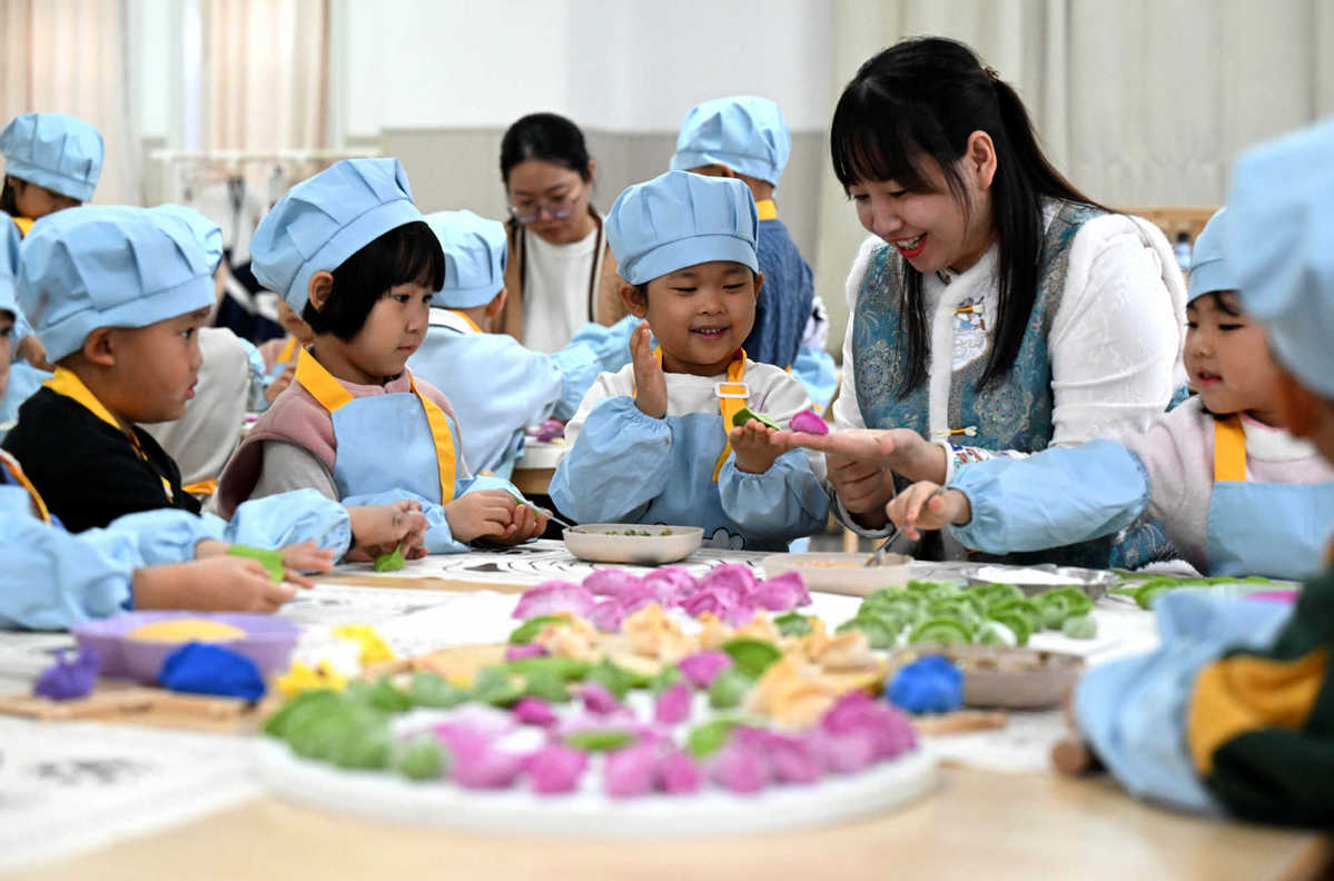 A teacher teaches children to make dumplings at a kindergarten in Zunhua city, North China's Hebei province, Dec 19, 2025. [Photo/Xinhua]