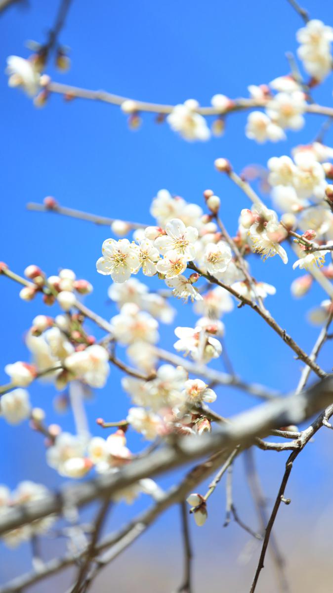 Petals shimmer in the sunlight as soft yellow stamens scatter forward. The white plum blossoms blend seamlessly with the well-arranged village cottages, set against a backdrop of clear, azure skies.