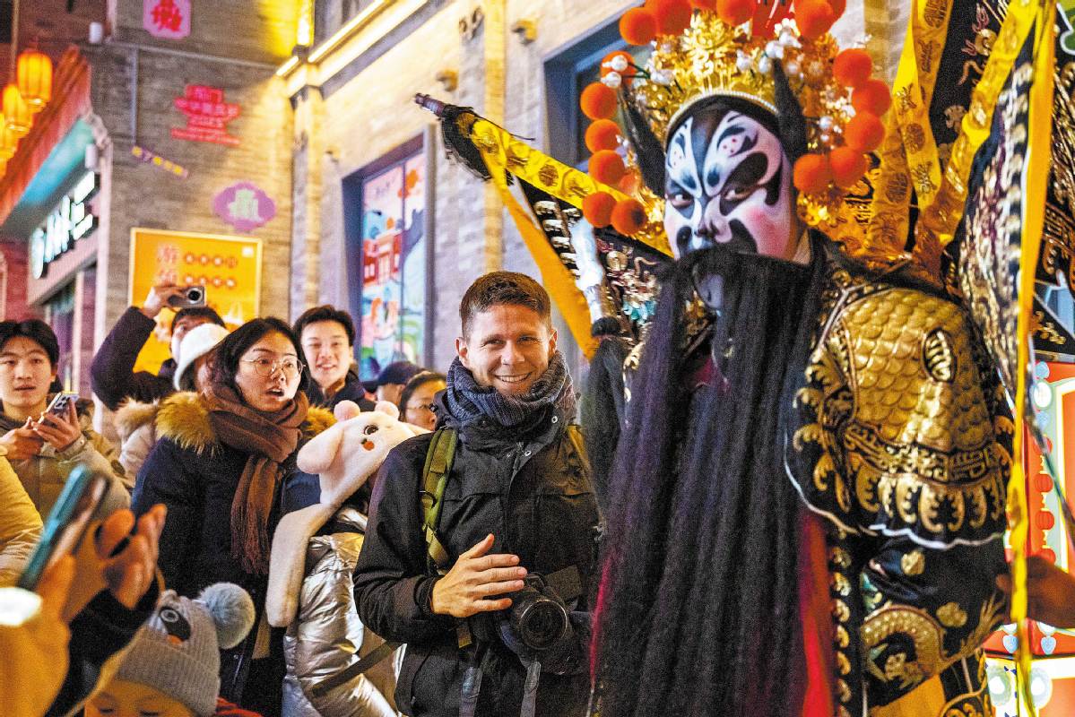 A foreign tourist poses with a performer wearing a Peking Opera costume, while visiting the bustling Qianmen commercial area in Beijing on Feb 25, 2026. CHEN QIANG/FOR CHINA DAILY