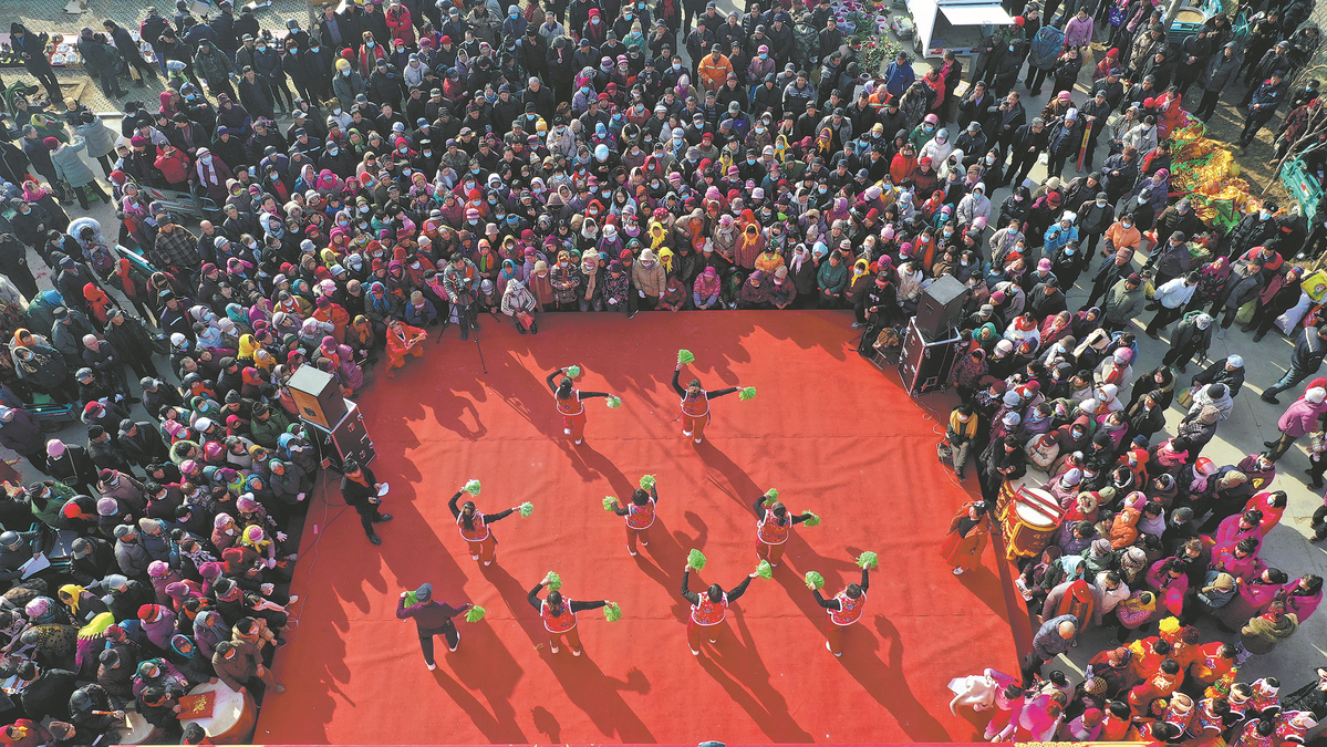 People watch song and dance performances at Beihu marketplace in Rizhao, Shandong province, on Jan 28, 2027. As Spring Festival approaches, countryside fairs across the nation are brimming with a festive atmosphere. People gather to sing and dance, bustling through markets amid a cheerful atmosphere as they stock up on festive goods. [Photo provided to China Daily]