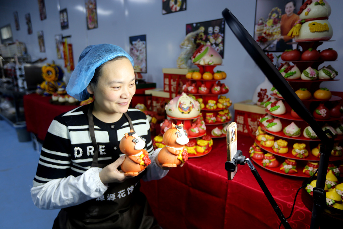 Employees at a Huabobo workshop in Lianyungang, Jiangsu province, livestream sales of festive steamed buns for the Lunar New Year, on Jan 28, 2026. [Photo/Xinhua]