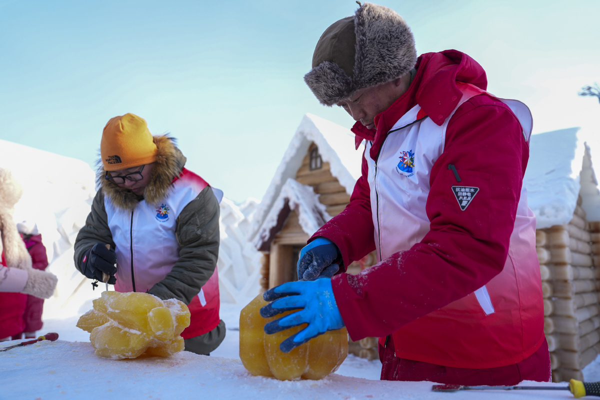 Sculptors carve plant-dyed ice sculptures at the Harbin Ice and Snow World in Harbin, Northeast China's Heilongjiang province, Jan 28, 2026. Using plant-dyed ice for carving, ice sculptors brought a fresh visual experience to the art of ice sculpture at this year's Harbin Ice and Snow World. [Photo/Xinhua]