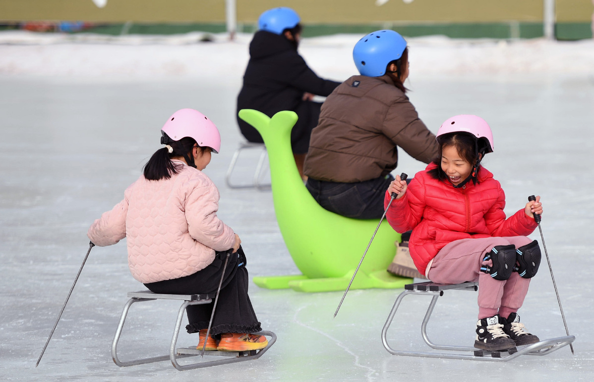Visitors glide across the ice on sleds during an event at the Lakefront Reading Garden in Zhenluoying town, Pinggu district of Beijing on Jan 28. The "2026 Pinggu Peach Charm Zhenluoying Second Ice and Snow Carnival" officially opened at the garden on the same day. Throughout the carnival, guests can enjoy various winter activities such as ice sledding and curling. [Photo/Xinhua]