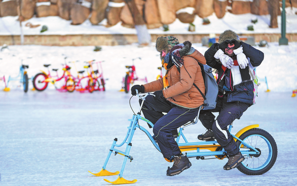 Foreign tourists ride an ice bicycle on Jan 8 at the Sun Island scenic spot in Harbin, the capital of Heilongjiang province. An ongoing snow sculpture art expo at the scenic spot is attracting visitors to its stunning ice and snow landscapes. WANG JIANWEI/XINHUA