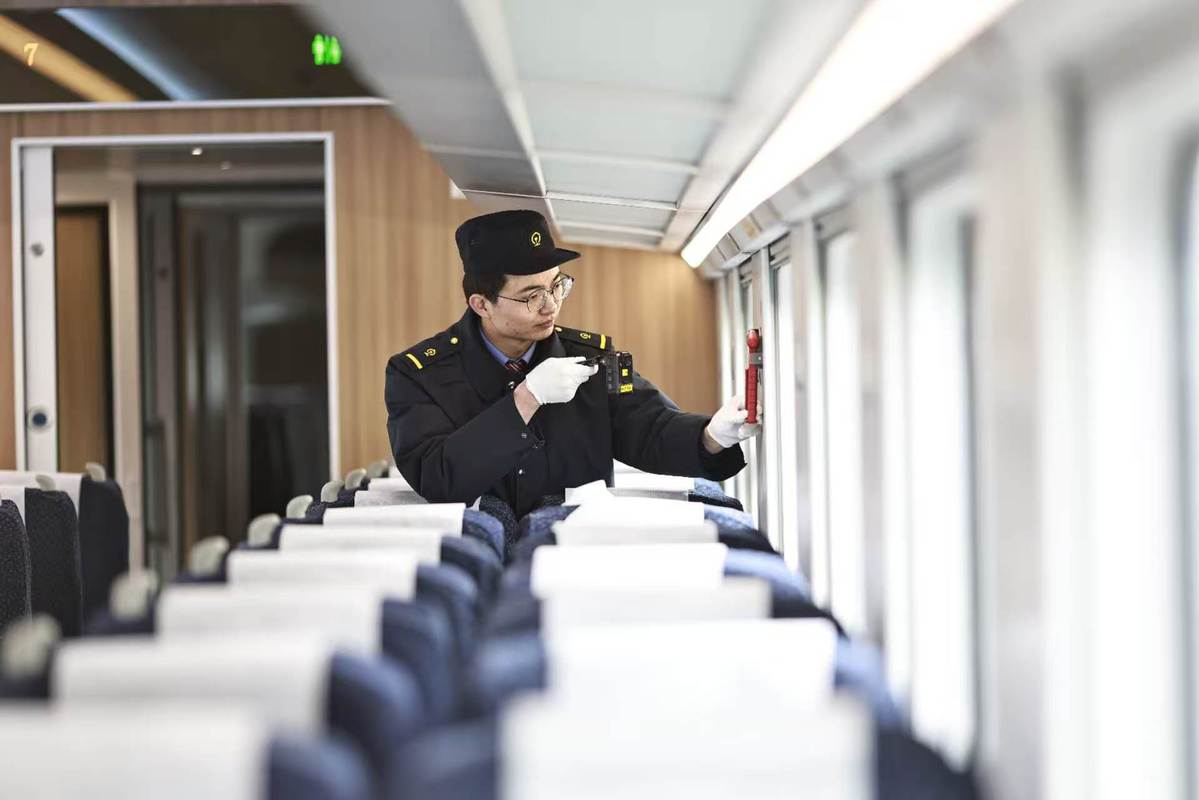 A railway staff member carries out a safety inspection on CR200J bullet trains in Chongqing on Jan 29, 2026. [Photo by Su Zhigang/For chinadaily.com.cn]