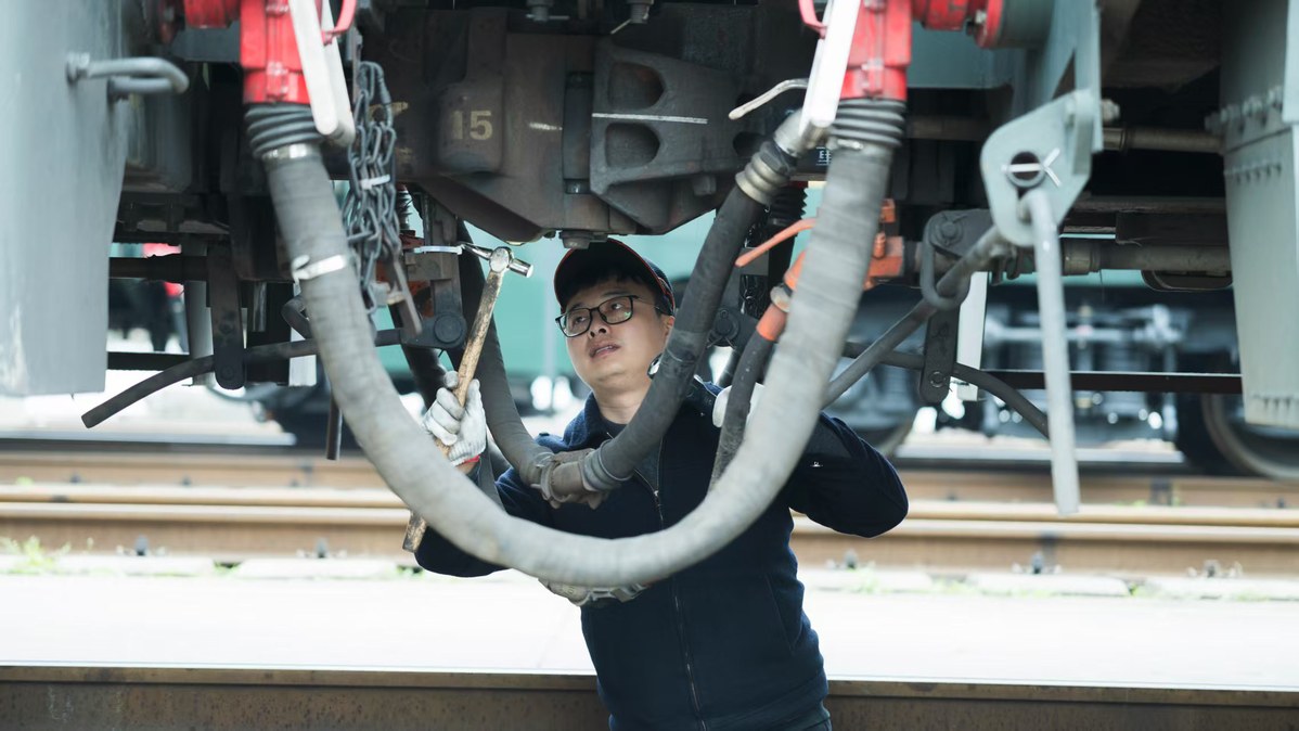 A maintenance worker checks a train in Chongqing on Jan 29, 2026. [Photo by Su Zhigang/For chinadaily.com.cn]