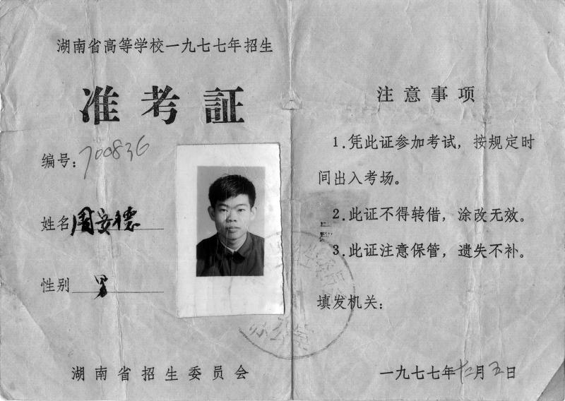 1978年,时年33岁的我以湖北省黄冈地区文科第一名的成绩考上了大学。七七、七八级大学生是在特殊年代考进大学一个特殊的群体,是在国家中断11年后又恢复高考,经历了最激烈的高考竞争后脱颖而出、最终获得改变命运机会的充满幸运的一个群体,有幸赶上了恢复高考的晚班车!