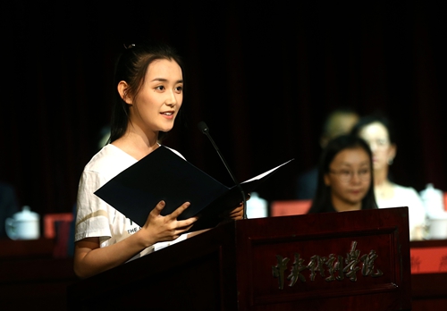 新生代表蒋依依在开学典礼上发言。(中国日报记者 邹红 摄)