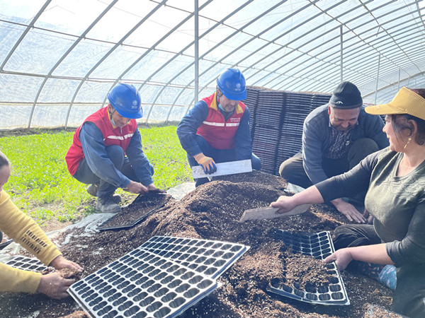 国网喀什供电公司员工帮助种植户将辣椒苗放到培养基(曹洋 摄)