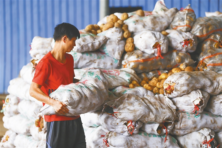 10月9日,在海口南北蔬菜批发市场,工人搬运从甘肃运抵海口的马铃薯。海南日报记者 张茂 摄