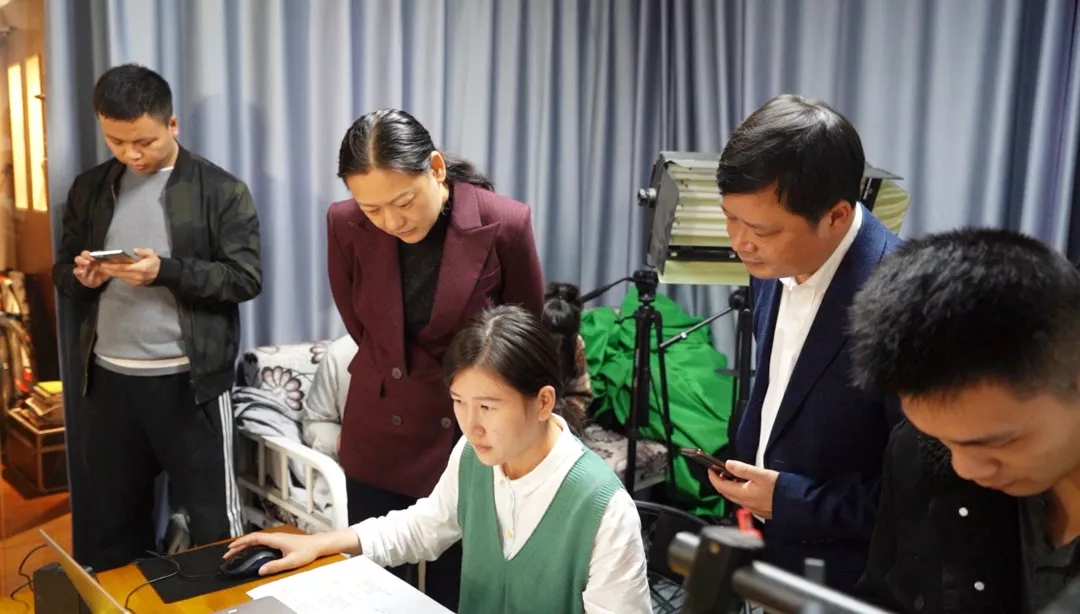 安福县副县长王煜、安福县文广新旅局局长王宁胜与江西影视.旅游频道主持人曹洋、新媒体负责人何张伟沟通直播事宜。