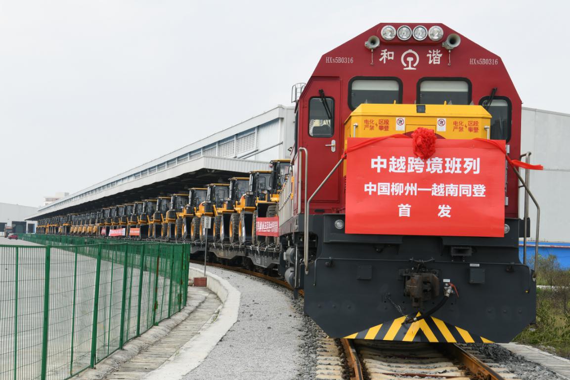 图为搭载柳工35台设备的中越跨境首趟班列发车