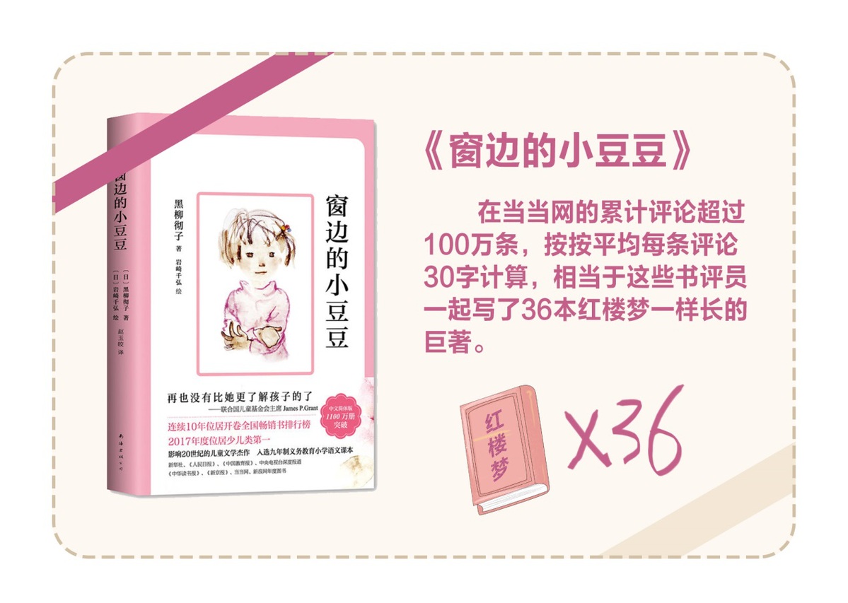 当当儿童阅读大数据显示,在最受孩子欢迎的500本童书中,中外童书占比接近1:1。在美国、日本、法国、德国、韩国的绘本最受中国儿童欢迎。许多童书不仅俘获了孩子的“芳心”,也让家长像自来水一样主动发起评论。2018年家长最热议的童书为:《窗边的小豆豆》《夏洛的网》《淘气包马小跳》。其中儿童文学杰作《窗边的小豆豆》已累计评论超过100万条。
