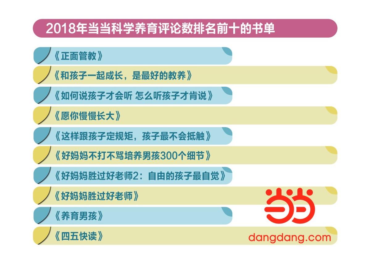 一方面,家长们为孩子购买童书,陪孩子听儿童读物;另一方面,他们也用科学理论做指导,从亲子家教类图书中找到教养孩子的方法论。随着越来越多90后升级为父母,2018年当当育儿孕产、家教类图书销量持续增长,亲子家教图书销售码洋同比增长50%。家教方法、家教理论、素质教育、育儿百科和亲子关系是2018年排名前五的图书科学养育类图书,过去五年的当当大数据显示,家长尤其关注孩子的素质教育成长,这一品类图书连续五年排位持续攀升。