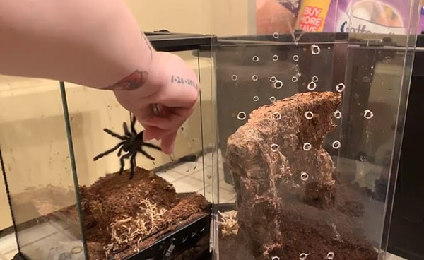 【环球网综合报道】据英国《每日邮报》4月17日报道,美国爱荷华州一名女子为宠物蜘蛛喂食时,意外发生了。这只塔兰图拉毒蜘蛛顺着镊子爬向女主人的手,幸好女主人反应迅速,及时甩开了镊子,避免了被毒蛛咬伤。