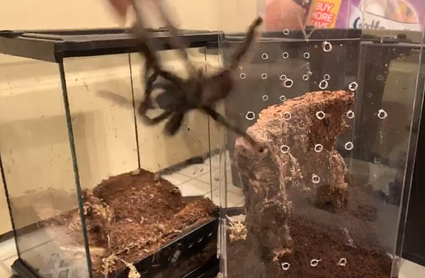 在这段14秒的视频中,该女子用一把镊子小心翼翼地把食物放进宠物蜘蛛所在的玻璃容器中。出乎意料的是,这只名叫丹迪的蜘蛛突然顺着镊子扑向她的手,女主人惊恐地对蜘蛛破口大骂,迅速甩掉了镊子和这只八条腿的蜘蛛。