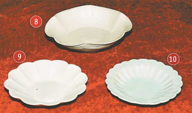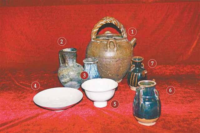 汉东古城出土的部分文物:①酱秞瓷罐、②酱秞执壶、③西坝窑窑变胆式瓷瓶、④青秞刻花瓷碟、⑤青白瓷高足碗、⑥⑦西坝窑黑秞瓷执壶、⑧青白瓷盘、⑨⑩青秞瓷碟