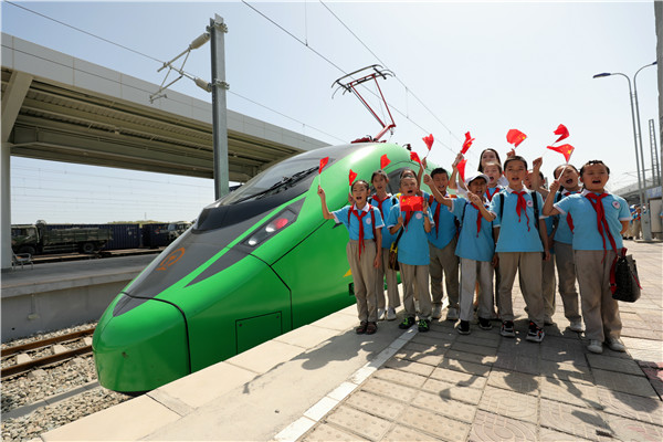 中国日报乌鲁木齐8月9日电(记者 毛卫华)8月8日9:05分,C8802次“复兴号”时速160公里动车组列车驶出乌鲁木齐站向着南疆重镇库尔勒飞驰而去,“绿巨人”全新亮相新疆,嘹亮的汽笛声让人们铭记这一刻:新疆从此进入“复兴号”时代。