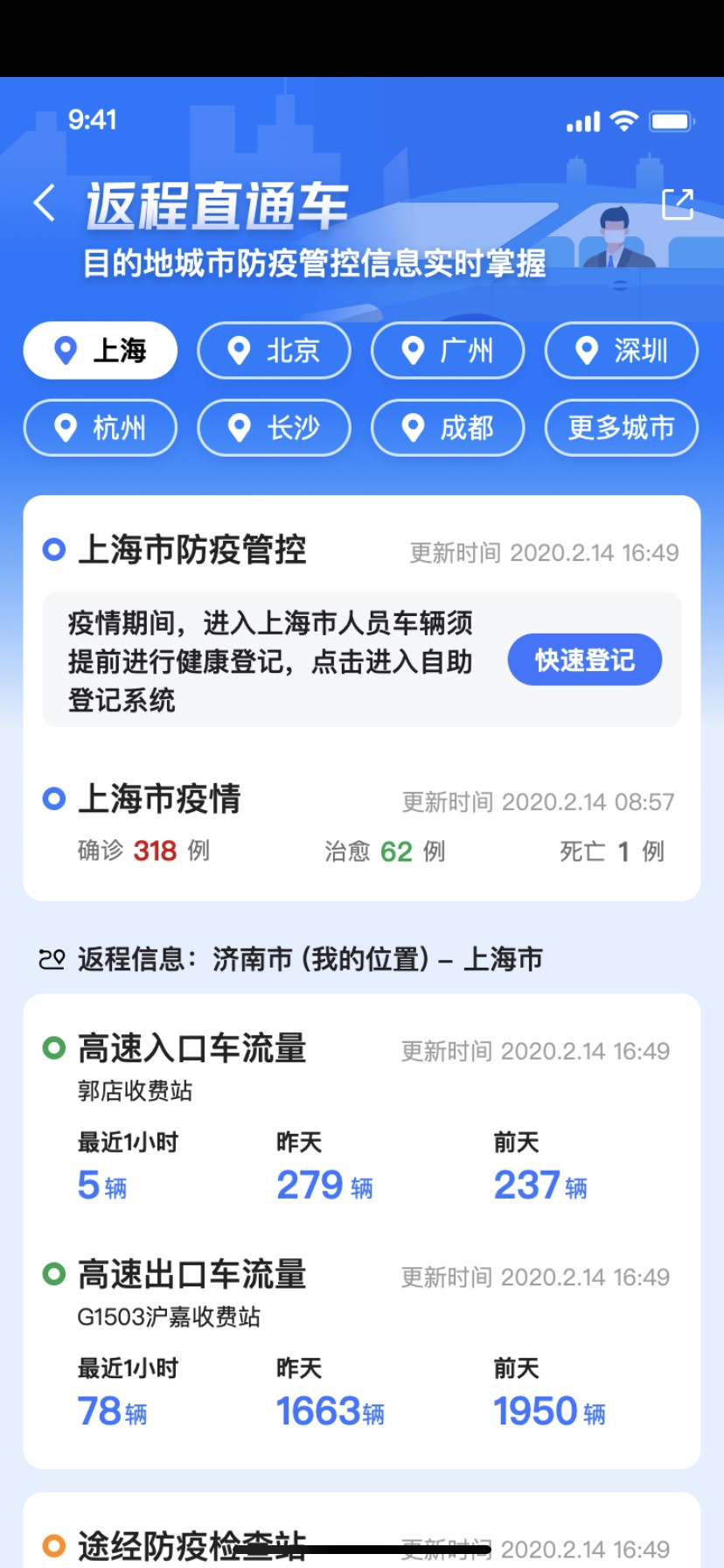 用户可直接查看返程沿途实时交通及疫情信息,真正做到心里有数