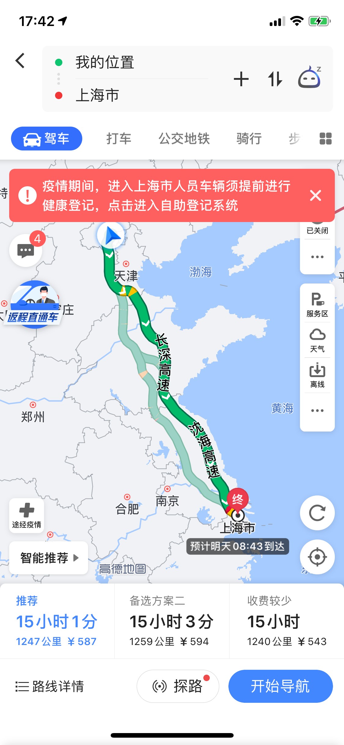 用户进行导航规划时会收到返程途中禁限行措施、防疫检疫站信息等重要信息提示