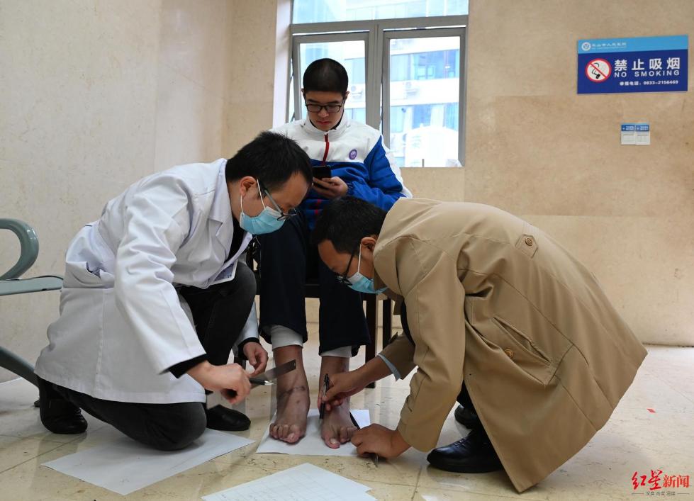 除吉尼斯世界纪录认证官外,乐山市人民医院医生李松和记者作为纪录申请见证人全程参与了测量和见证工作。在当天8时、14时、20时三个时间点,分别三次测量了小宇的身高(站高)、躺高以及手长、手跨、脚长、脚宽、臂展及半臂跨等数据。