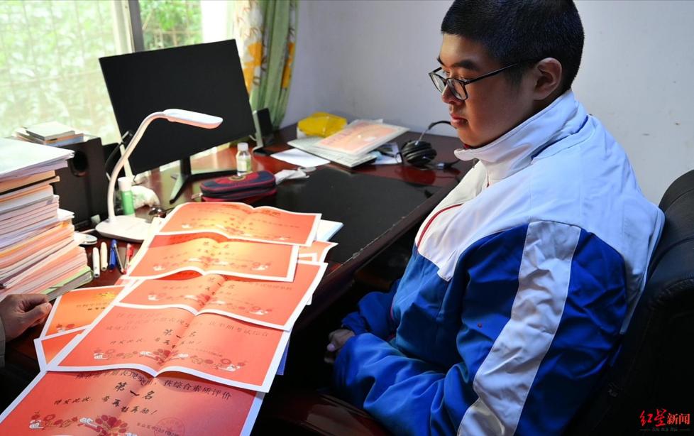 为了不影响小宇的生长发育和视力,从读小学开始,他在教室里也使用特制的桌椅,并换了好几回。读初中后,这套桌椅又随着他搬到了新校园。吴梅说,不仅是桌椅,小宇睡的床也是定制的,2.5米长;衣服一般都是穿定制的校服,而鞋子要穿56码。