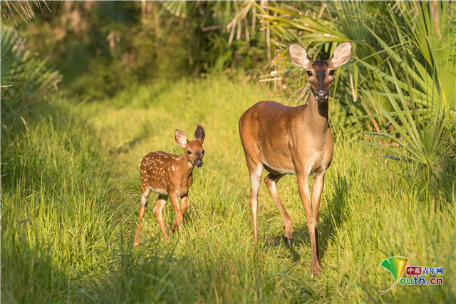 当地时间2016年7月3日,美国南卡罗莱纳州埃迪斯特岛,一头白尾母鹿带着小鹿在林间散步。