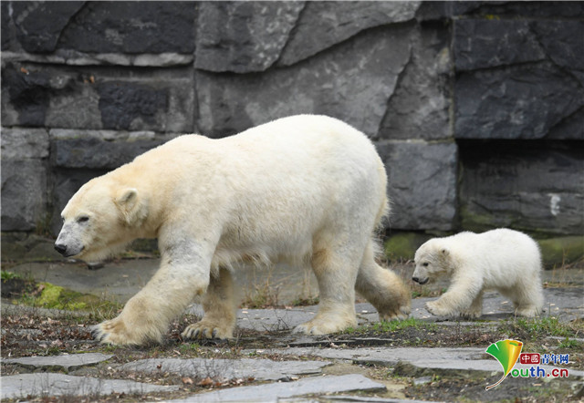 当地时间2019年3月17日,德国柏林的蒂尔帕克,柏林动物园(Tierpark)新生小北极熊与熊妈妈在户外玩耍,吸引了大批游客前来观看。