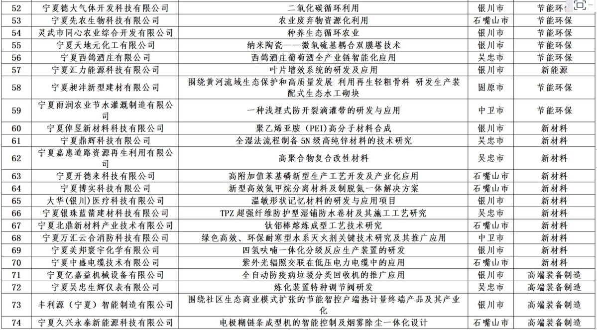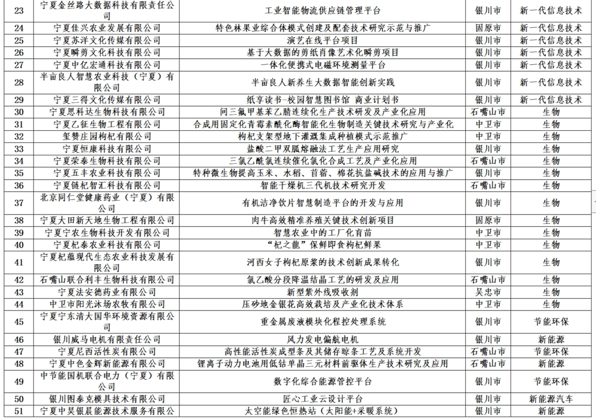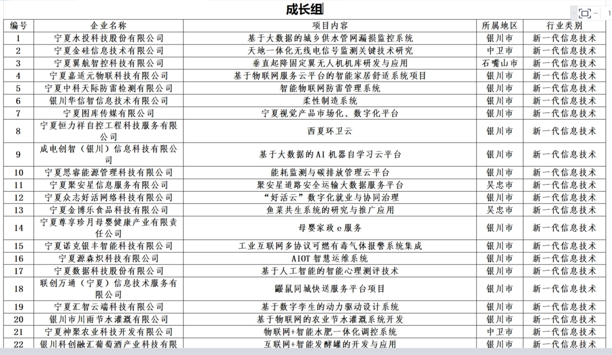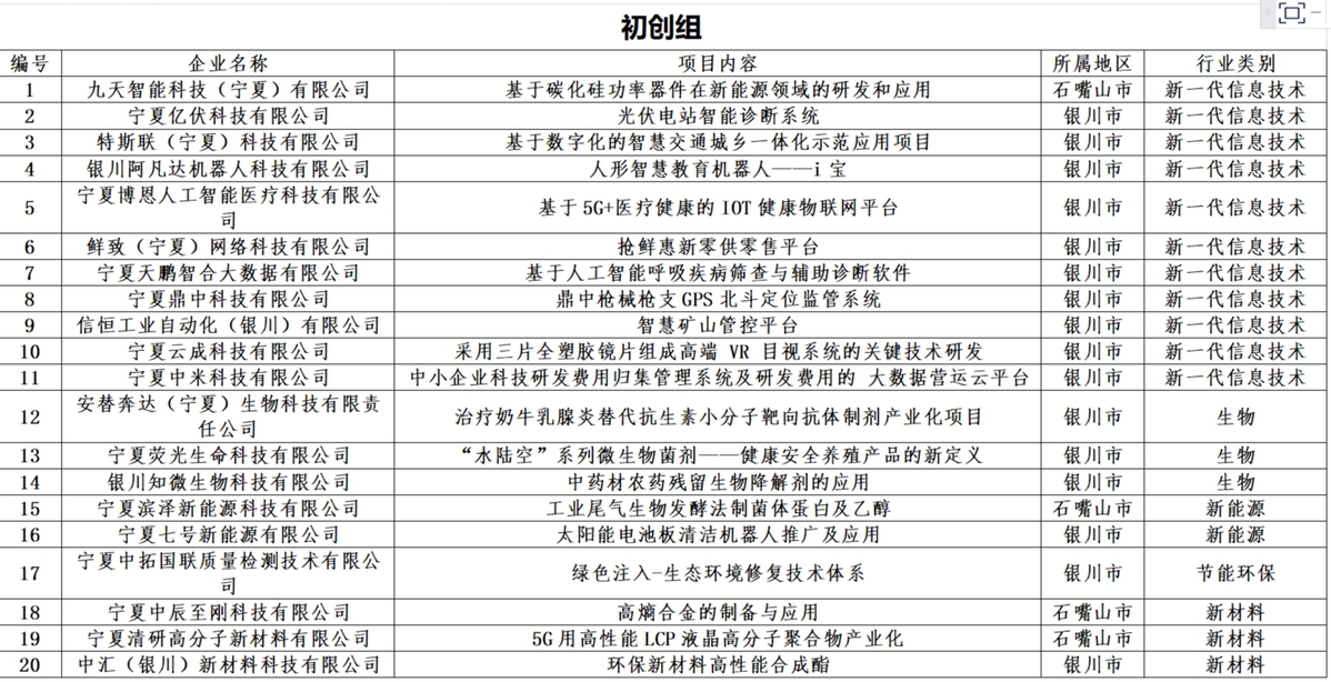 第十届中国创新创业大赛(宁夏赛区)暨第六届“中国银行杯”宁夏创新创业大赛晋级行业赛企业名单