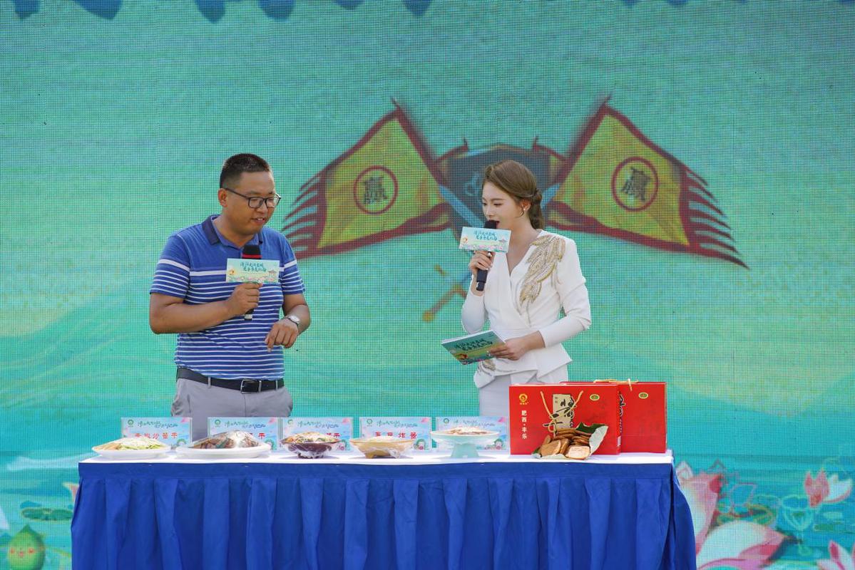除了舞蹈《只此丰乐》,在开幕式现场,丰乐镇4名企业家进行了打擂推介,秀出了自己的“招牌”。丰乐酱干、荷叶茶、花式足球等多个元素碰撞,共同诠释着“荷”主题,诠释着荷产业的兴旺撬动着乡村振兴。