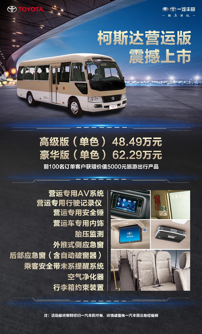 近年来,随着相关法律法规对于营运要求的逐步提升,一汽丰田柯斯达也紧跟国家政策乘势而上,正式亮相了柯斯达全新营运版。新车不仅充分对应了最新的法律法规要求,更能够有效助力客户的经营运行。如今的柯斯达,从内而外,从动力性能到舒适程度,都凸显着一汽丰田卓越的产品品质。