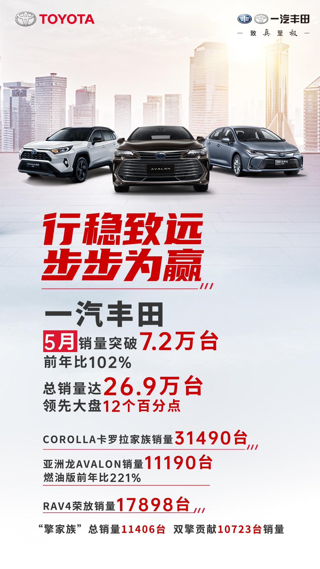刚刚过去的5月,尽管汽车行业依旧笼罩在疫情的阴霾之下,一汽丰田依然实现了月度销量突破7.2万台,批售量同比增长2%的成绩。截至目前,一汽丰田品牌总销量已达到26.9万台,领先大盘12个百分点,正在朝着年销目标稳步迈进。这一点充分说明,产品是品牌发展的根基,只要产品优秀,就可以争取到足够大的市场空间。