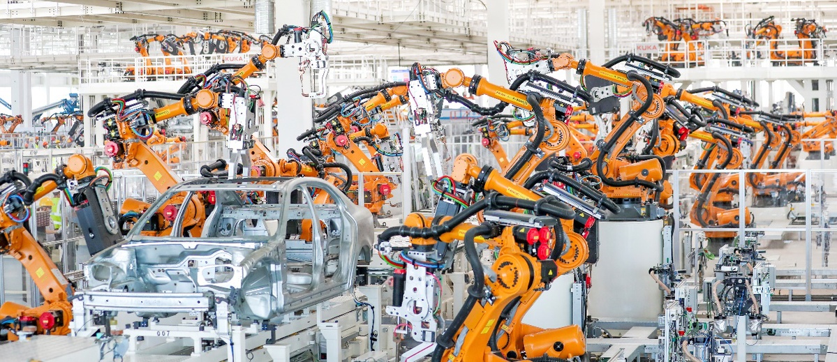 以车身车间为例,各生产线上的智能机器人协同工作,轻松完成白车身的焊接、定型等工序,并可实现24小时全自动作业,是世界最先进的高端智能“黑灯工厂”。