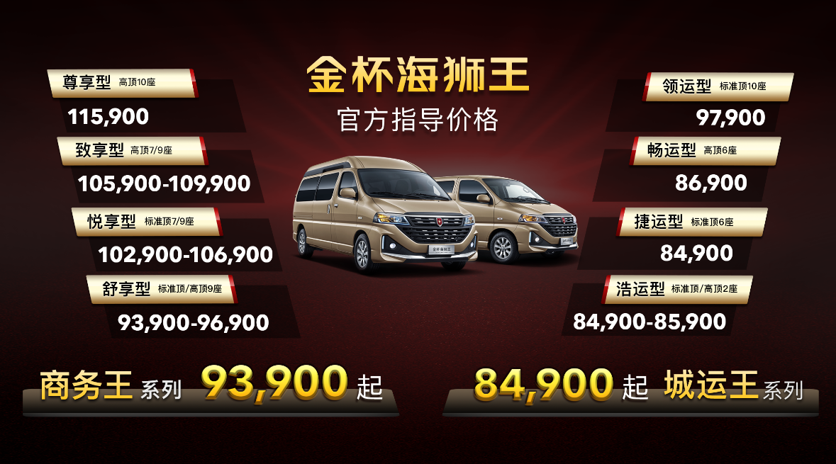 11月24日,华晨雷诺金杯合资后首款LCV产品——金杯海狮王在沈阳工厂迎来上市,全新金杯海狮王分为城运王和商务王两大系列,城运王系列售价为84,900元-97,900元,商务王系列售价为:93,900元-115,900元。