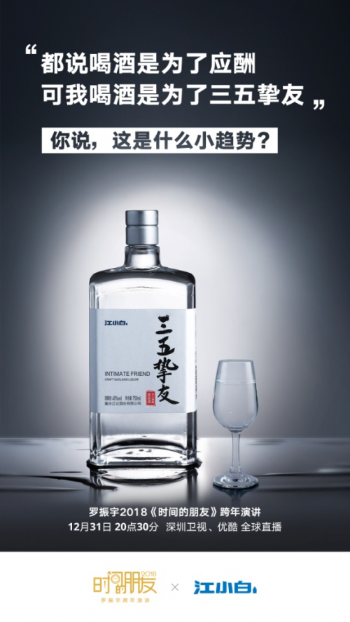 江小白带着传统高粱酒的“老味新生”使命,尝试唤醒年轻一代对中国酒的热爱。今年,与《时间的朋友》跨年演讲首次跨界合作,推出了“江小白三五挚友X时间的朋友联名限量款高粱酒”。