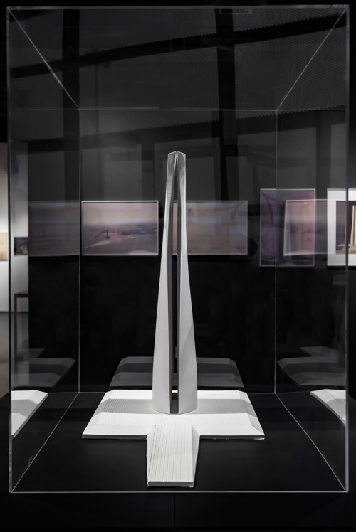 “静默与隐逸”中展出的作品,是王大闳建筑理想的寄托。“登陆月球纪念碑”是其登峰造极之作,也是其将自身的建筑理想尽然表达的作品。观展者可通过模型、图片档案、VR技术了解、体验这一建筑设计。该设计有一对洁白的碑塔,耸立向无边的苍穹,象征着人类伸向天空的一双手臂。设计展现了人类对自由、对攫取月亮的渴望与对宇宙的崇拜。恰逢人类登陆月球50周年,这一设计汇聚了50年前成功登月时激越的冲击,将它们凝聚成永恒的感恩。