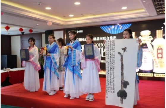 大师手作,惊艳亮相:现场,新文化酒发布会上,身着汉服的礼仪对文化酒以及名家书画进行了展示。三款新文化酒一亮相,立刻吸引了书画界知名人士、书画爱好者、媒体、合作伙伴以及重要VIP客户在内100多人的目光,共同见证了中国酒中新品“文化酒”上市盛会。