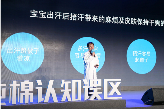 活动现场小朋友们通过触摸感受不同阶段生产的面料,在测试中对纯棉面料有了新的认识。上海儿童医学中心专家吴虹女士就“婴幼儿出汗穿衣及穿衣困扰”问题进行了现场答疑,她表示孩子出汗捂汗极易引发着凉感冒,且爱出疹子、痱子等,会给孩子的健康成长造成不良影响。