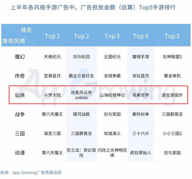 而在游戏市场上,根据AppGrowing监测数据显示,今年上半年仙侠题材游戏(玄幻也归为此类)为主要热门投放题材之一,其中主打玄幻题材的《斗罗大陆》为该类别投放TOP1的游戏,而这也代表着其收入变现能力非常强。