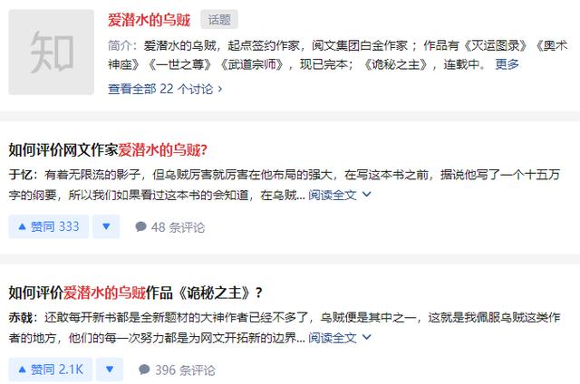 而在网上,爱潜水的乌贼在这一方面的风评也颇为相似。在知乎上有个"如何评价网文作家爱潜水的乌贼?"的话题,上面就有不少书粉对他个人以及每部作品的客观评价,其中不乏对其个人及创作创新追求的认可。