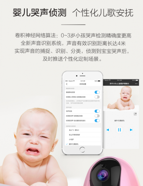 对于爸爸妈妈来说,最可怕的不是宝宝的哭闹,而是宝宝哭闹他们却不在身边。为此,苏宁小Biu儿童看护摄像头特别采用了卷积神经网络算法,该算法是人工神经网络发展的新台阶,对于0-3岁宝宝的声音能够进行高精确度的捕捉、识别和分类,并且在精准的侦测到哭声后,会自动播放在线儿歌、童谣等,对宝宝进行安抚。在配置一流算法技术的基础上,还搭载了全新的声音识别系统,最远识别距离可以达到4米。“远程哄娃小能手”当之无愧!