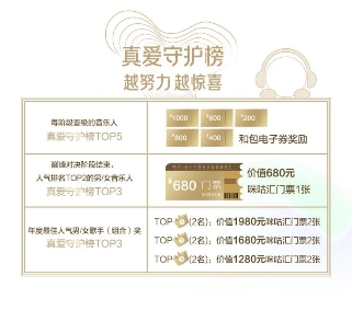 “宠粉力十足”的第十三届咪咕汇,还为努力投票的乐迷们准备了超值福利。在巅峰对决阶段,斩获“年度最佳人气男(组合)/女歌手奖”乐迷真爱守护榜前三名的乐迷,将获得咪咕汇黄金席位等绝佳视野门票,直击爱豆闪耀舞台;在票选每个阶段助力结束后,每位音乐人真爱守护榜前5名的乐迷,将依次获得和包电子券奖励。