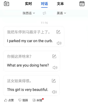 对话翻译功能除了支持基础的中文与英语、日语、韩语、法语、俄语、泰语等31种语言互译外,还独家上线了长沙话、东北话、闽南话、上海话等23个方言与外语间的互译功能。