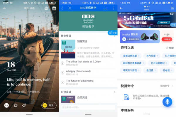 咪咕灵犀不仅支持多种翻译功能,同时提供海量免费正版的英文学习内容,如BBC、TED等专栏;还提供智能语音助手功能,让您打电话、查天气、查话费等生活服务,一呼即应。